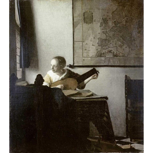 The Lute Player Black Modern Wood Framed Art Print by Vermeer, Johannes