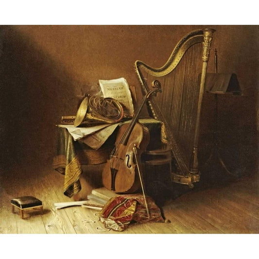 Still Life With Musical Instruments Black Modern Wood Framed Art Print by American School