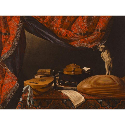 Still Life with Musical Instruments, Books and Sculpture Black Modern Wood Framed Art Print by Evaristo, Baschenis