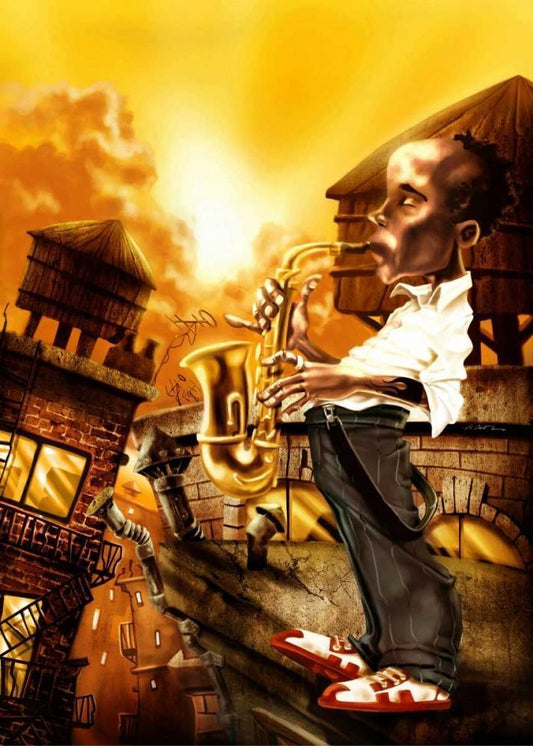 The Saxophonist -2 White Modern Wood Framed Art Print with Double Matting by Alvez, A. - Perez, A.