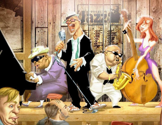 Musicians Jam Session White Modern Wood Framed Art Print with Double Matting by Alvez, A. - Perez, A.