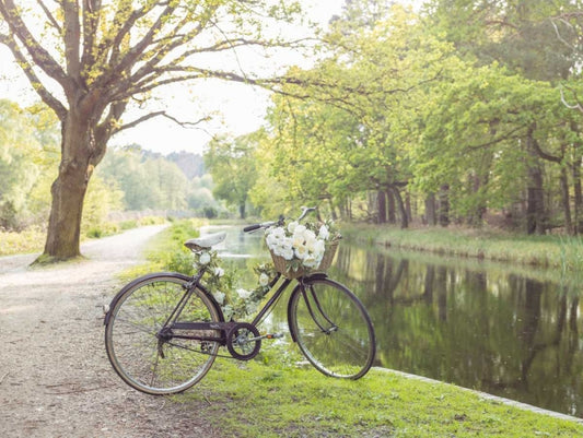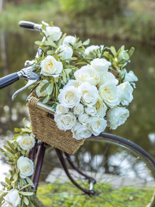 Bicycle with bunch of white roses by the canal White Modern Wood Framed Art Print with Double Matting by Frank, Assaf