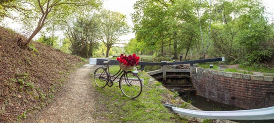 Bicycle with bunch of red roses by the canal White Modern Wood Framed Art Print with Double Matting by Frank, Assaf