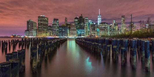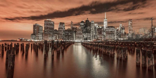 Evening view of Lower Manhattan skyline, New York White Modern Wood Framed Art Print with Double Matting by Frank, Assaf