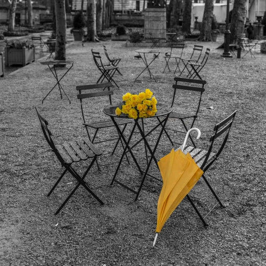 Bunch of roses and umbrella on table and chair at the park, New York White Modern Wood Framed Art Print with Double Matting by Frank, Assaf