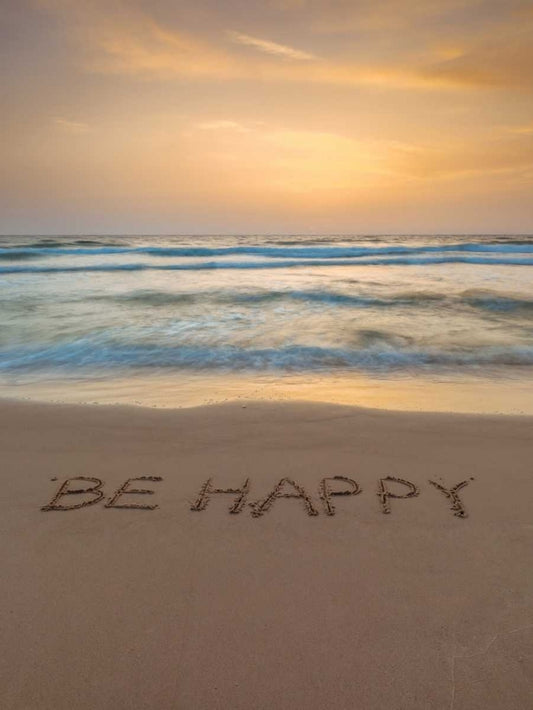 Sand writing - Word Be Happy written on beach White Modern Wood Framed Art Print with Double Matting by Frank, Assaf