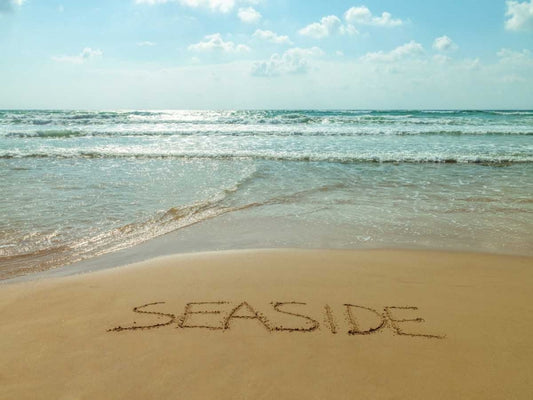 Word Seaside written in sand on the beach White Modern Wood Framed Art Print with Double Matting by Frank, Assaf