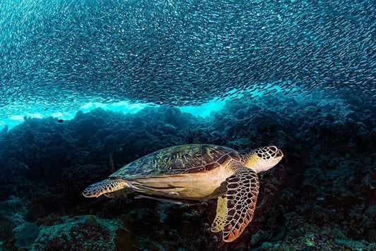 Turtle and Sardines White Modern Wood Framed Art Print with Double Matting by Jager, Henry
