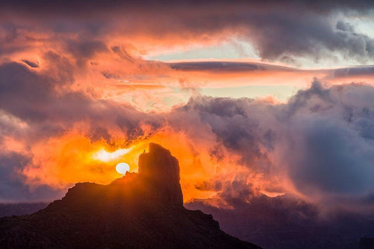 Spain-Canary Islands-Gran Canaria Island-Tejeda-mountain landscape with Roque Bentayga-sunset White Modern Wood Framed Art Print with Double Matting by Bibikow, Walter