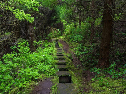 Levada-traditional irrigation channel near Cabeco Gordo in dense forest White Modern Wood Framed Art Print with Double Matting by Zwick, Martin