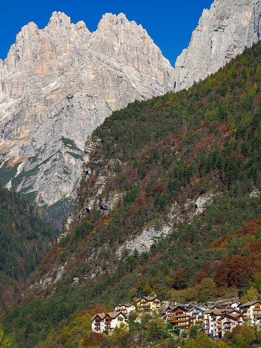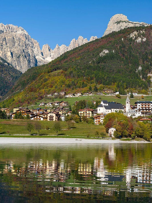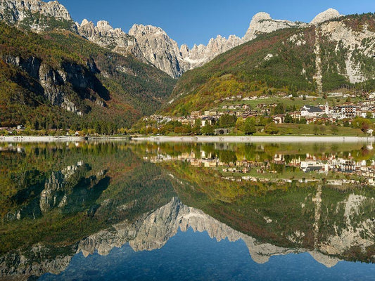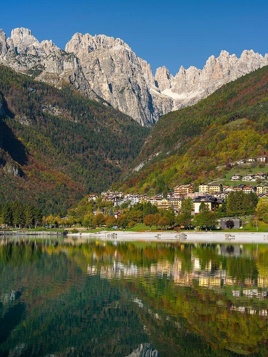 Molveno at lake Lago di Molveno in the Dolomiti di Brenta Dolomites White Modern Wood Framed Art Print with Double Matting by Zwick, Martin