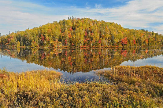 Canada-Ontario-Goulais River Forest reflection in lake White Modern Wood Framed Art Print with Double Matting by Jaynes Gallery