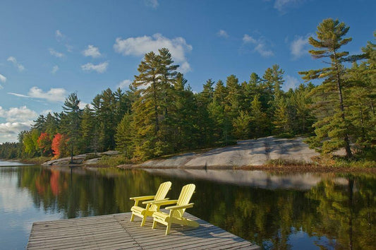 Canada-Ontario-Grundy Lake Provincial Park Muskoka chairs on lake dock White Modern Wood Framed Art Print with Double Matting by Jaynes Gallery