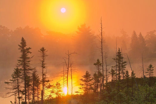 Canada-Ontario-Torrance Barrens Dark-Sky Preserve Foggy sunrise on forest White Modern Wood Framed Art Print with Double Matting by Jaynes Gallery