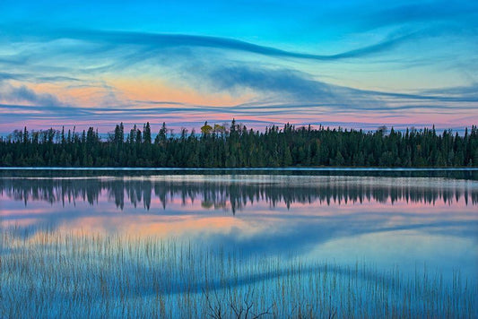 Canada-Ontario-Greater Sudbury Lake grasses and cloud reflections at sunrise White Modern Wood Framed Art Print with Double Matting by Jaynes Gallery
