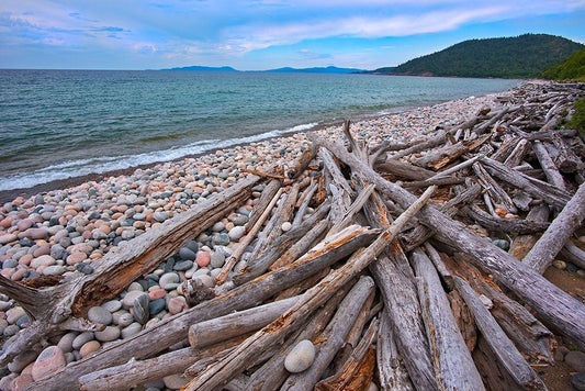 Canada-Ontario-Marathon Rocks and driftwood on Pebble Lake Superiors Beach White Modern Wood Framed Art Print with Double Matting by Jaynes Gallery