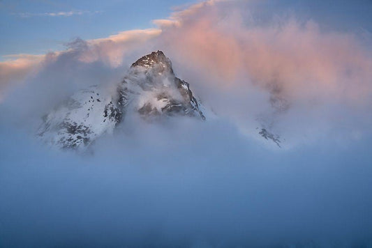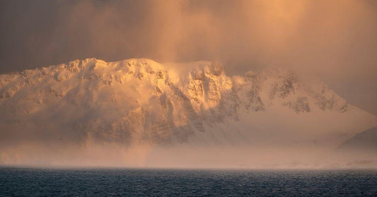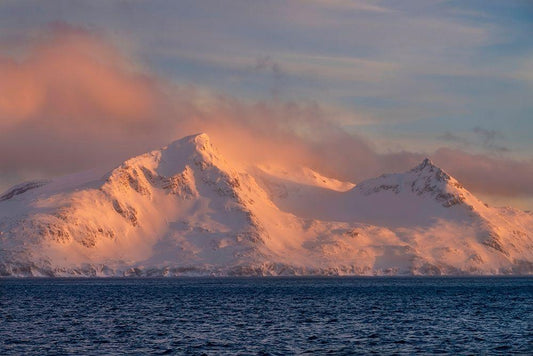 Antarctica-South Georgia Island-Stromness Bay Cloud-covered mountain at sunset White Modern Wood Framed Art Print with Double Matting by Jaynes Gallery