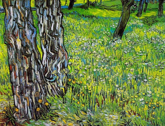 Pine Trees And Dandelions In The Garden Of Saint Paul Hospital 1890 White Modern Wood Framed Art Print with Double Matting by Van Gogh, Vincent