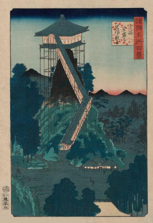 Nihon Temple on Mount Yokogiri at Boshu (Boshu nokogiriyama nihonji), 1859 White Modern Wood Framed Art Print with Double Matting by Hiroshige, Utagawa