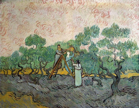 Women Picking Olives White Modern Wood Framed Art Print with Double Matting by Van Gogh, Vincent