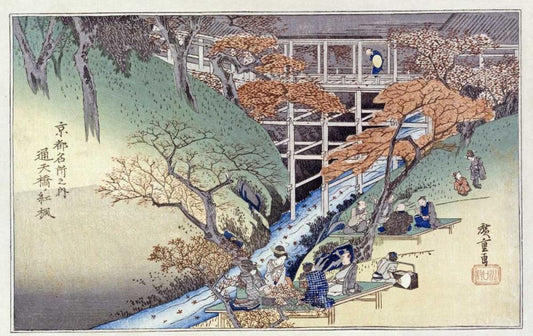 Red Maple Leaves at Tsuten Bridge White Modern Wood Framed Art Print with Double Matting by Hiroshige