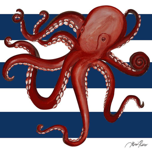 Red Octopus on Navy Stripes Gold Ornate Wood Framed Art Print with Double Matting by Ritter, Gina