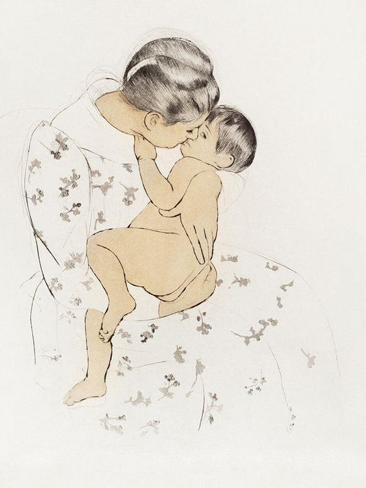 Mothers Kiss White Modern Wood Framed Art Print with Double Matting by Cassatt, Mary