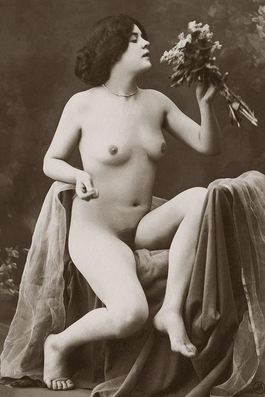 Nude with a Bouquet White Modern Wood Framed Art Print with Double Matting by Vintage Nudes