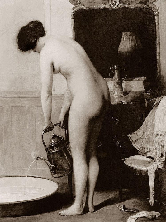 Pouring a Bath White Modern Wood Framed Art Print with Double Matting by Vintage Nudes