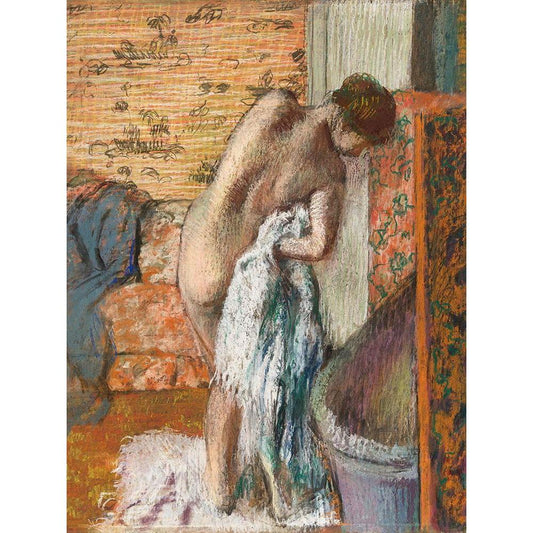 After the Bath, Woman Drying her Nape White Modern Wood Framed Art Print by Degas, Edgar