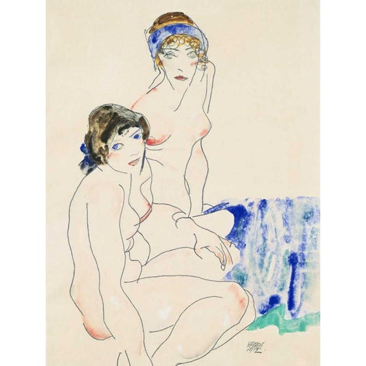 Two Female Nudes by the Water White Modern Wood Framed Art Print by Schiele, Egon