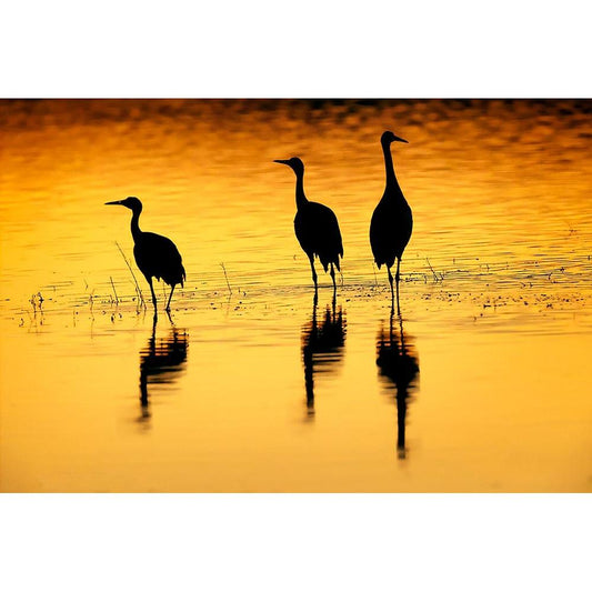 Sandhill cranes silhouetted at sunset Bosque del Apache National Wildlife Refuge-New Mexico Gold Ornate Wood Framed Art Print with Double Matting by Jones, Adam