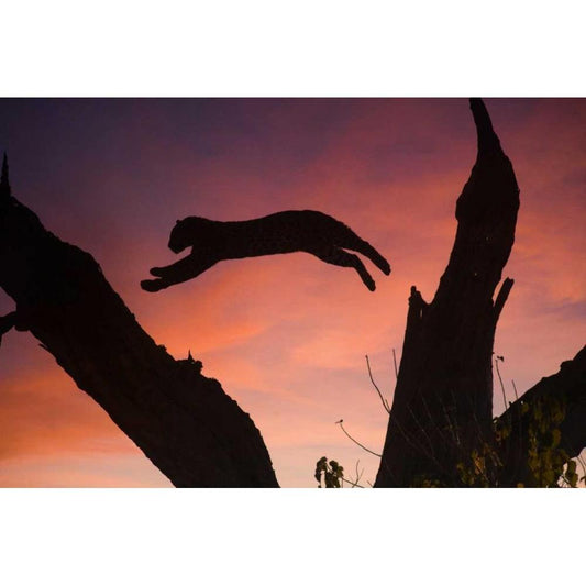 Botswana, Savuti Game Reserve Leopard leaping Gold Ornate Wood Framed Art Print with Double Matting by Zuckerman, Jim