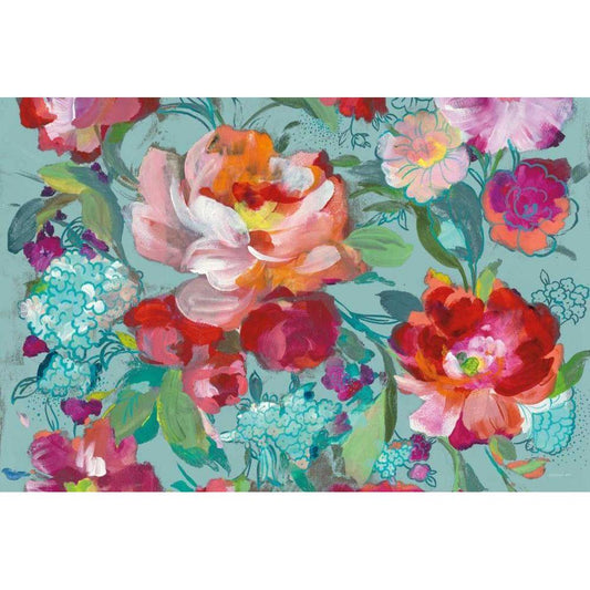 Bright Floral Medley Crop Turquoise Gold Ornate Wood Framed Art Print with Double Matting by Nai, Danhui