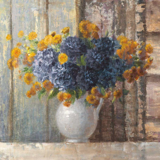 Fall Dahlia Bouquet Crop Blue Gold Ornate Wood Framed Art Print with Double Matting by Nai, Danhui
