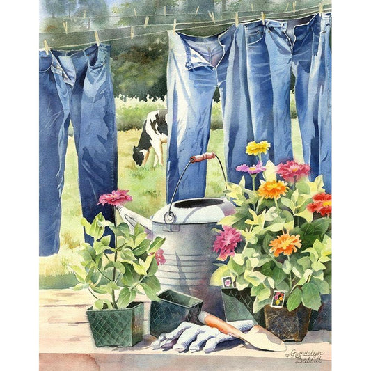 Blue jeans, Zinnias and Cow Gold Ornate Wood Framed Art Print with Double Matting by Babbitt, Gwendolyn