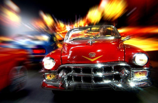 Cars in action - Cadillac rot White Modern Wood Framed Art Print with Double Matting by Debionne, Jean-Loup