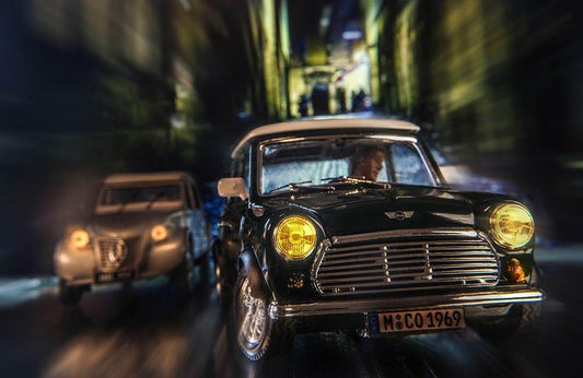 Cars in action - Austin Mini White Modern Wood Framed Art Print with Double Matting by Debionne, Jean-Loup