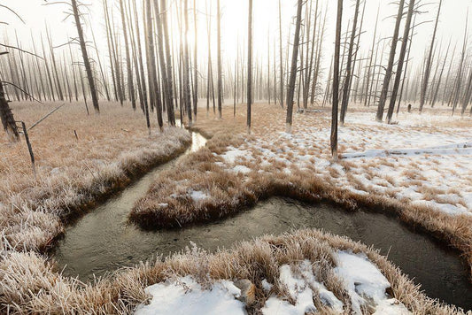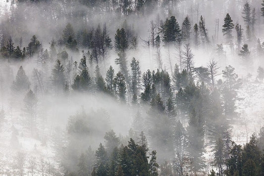 Foggy Morning at Tangled Creek, Yellowstone National Park White Modern Wood Framed Art Print with Double Matting by The Yellowstone Collection
