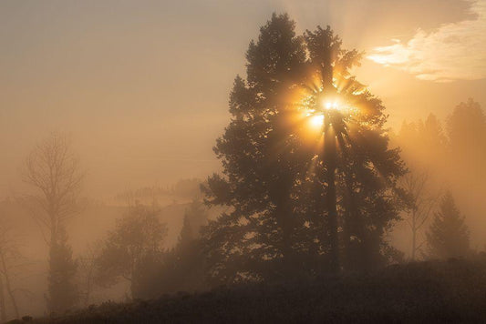 Foggy Sunrise, Blacktail Deer Plateau, Yellowstone National Park White Modern Wood Framed Art Print with Double Matting by The Yellowstone Collection