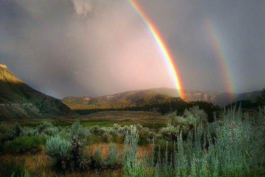 Double Rainbow from Lower Mammoth, Yellowstone National Park White Modern Wood Framed Art Print with Double Matting by The Yellowstone Collection