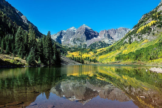 Autumnal view of Rocky Mountain peaks called the Maroon Bells-Colorado White Modern Wood Framed Art Print with Double Matting by Highsmith, Carol
