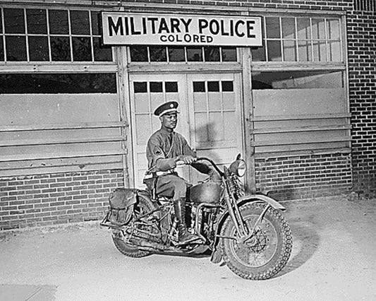 WWII An MP on motorcycle stands ready to answer all calls around his area. Columbus-Georgia White Modern Wood Framed Art Print with Double Matting by U.S. Archives
