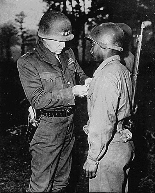 WWII Lt. Gen. George S. Patton-U.S. Third Army commander-pins the Silver Star on Private Ernest A. J White Modern Wood Framed Art Print with Double Matting by U.S. Archives