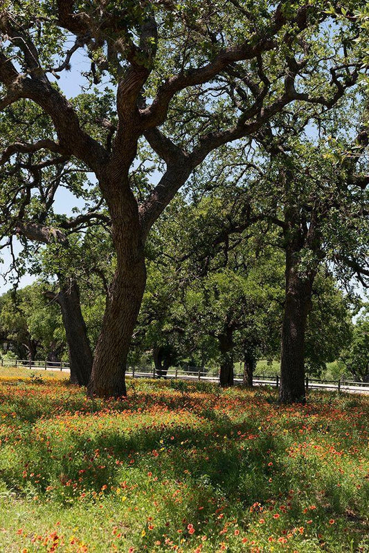 Shade trees and wildflowers on the LBJ Ranch, near Stonewall in the Texas Hill Country White Modern Wood Framed Art Print with Double Matting by Highmith, Carol