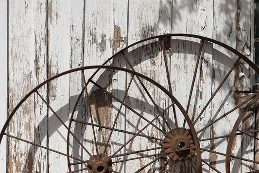Old wagon wheels against a shed in Buffalo Gap Historic Village, near Abilene, TX White Modern Wood Framed Art Print with Double Matting by Highmith, Carol