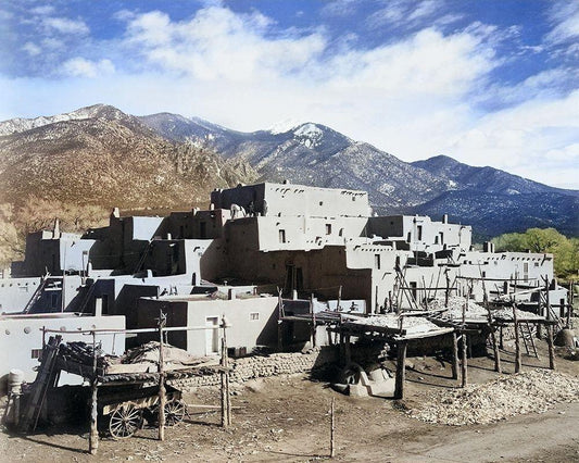 Full view of city-mountains in background-Taos Pueblo National Historic Landmark Color White Modern Wood Framed Art Print with Double Matting by Adams, Ansel