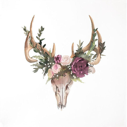 Deer Skull with Flowers Gold Ornate Wood Framed Art Print with Double Matting by Atelier B Art Studio