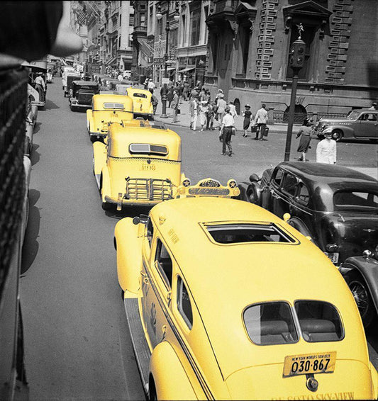 Yellow Cabs Black Ornate Wood Framed Art Print with Double Matting by Vintage Apple Collection