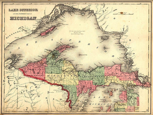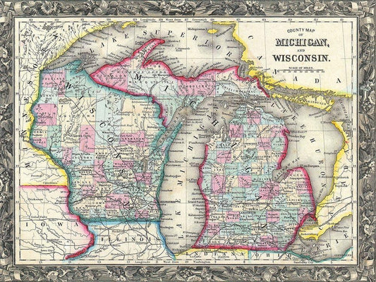 County map of Michigan and Wis White Modern Wood Framed Art Print with Double Matting by Sproul, Dan